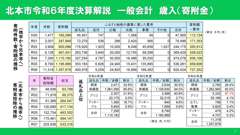 寄附金は、ふるさと納税寄附の増加により増加しました。ふるさと納税の増加は全国的な傾向で、全国での伸び率が13.9%、北本市の伸び率が13.5%でした。