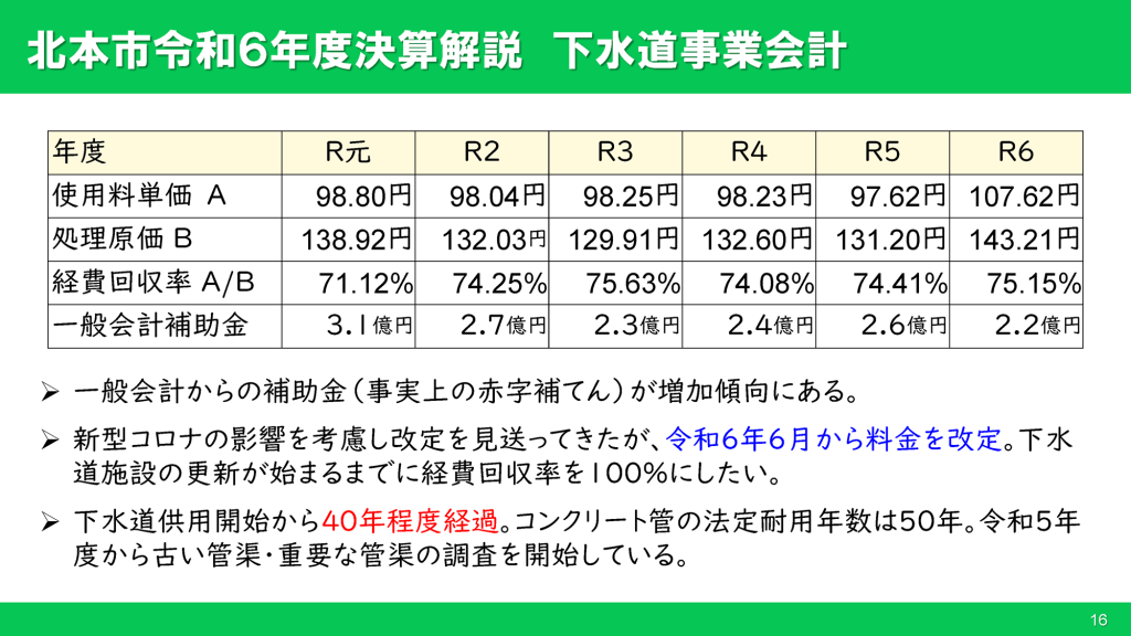 下水道事業会計では慢性的な赤字が発生し、これを一般会計から補てん(補助)していることが課題となっています。赤字を改善するため、令和6年6月から下水道使用料を約15%引き上げ、これにより75%程度だった経費回収率を80%程度まで向上させる目論見でしたが、県に支払う流域下水道事業負担金が大きく引き上げられたことで処理原価も上昇してしまったため、経費回収率は75.15%にとどまりました。