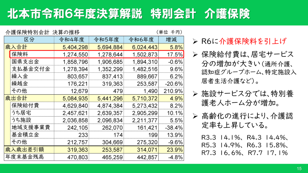 令和6年度から介護保険料を引き上げたため、介護保険料収入が17.5%増加しました。介護保険料収入が増加すれば、財政調整基金からの繰入金が減少するはずですが、こちらも6.2%増加しています。結果として歳入超過となり、約3.1億円の歳入歳出差引額が発生しています。