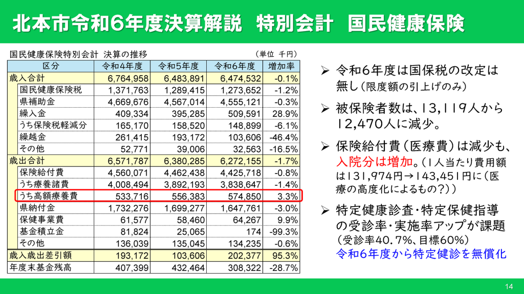 歳出決算額が減少する中でも増加しているのが入院分の医療費です。入院分の医療費が増加することで、高額療養費も増加しています。執行部は「医療の高度化によるもの」と説明していますが、これを裏付ける資料は示されていません。医療費が特に高額になるのは糖尿病(人工透析)なので、糖尿病を含む生活習慣病を予防するため、特定健診・特定保健指導の受診率・実施率の向上が課題となっています。