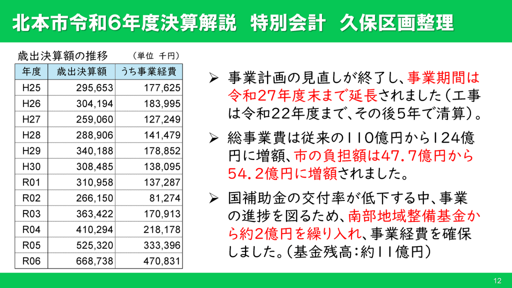 三宮市長が久保区画整理事業の見直し(デーノタメ遺跡範囲の除外、西仲通線の迂回)を決定してから開発の方向性が定まったことで、事業費を増加し、進捗を早めるようにしています。特に事業経費は、令和3年度まで1.7億円以下で推移していいたところ、令和4年度から毎年1億円以上増加しています。これに伴い、久保特定土地区画整理事業での市債発行も増加しています。
