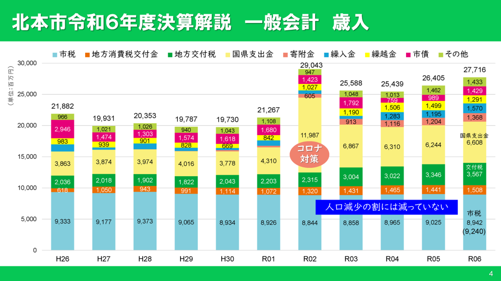 令和6年度の歳入決算額は約277億円、歳出決算額は約263億円で、いずれも令和2年度に次いで2番目の高額となりました。令和2年度は新型コロナ禍で国民1人10万円の給付(北本市だけで約66億円)を行ったことにより突発的に高額決算となりましたが、令和6年度は現下の人件費や物価高騰、行政重要の増大を背景に決算額が増加しているものです。