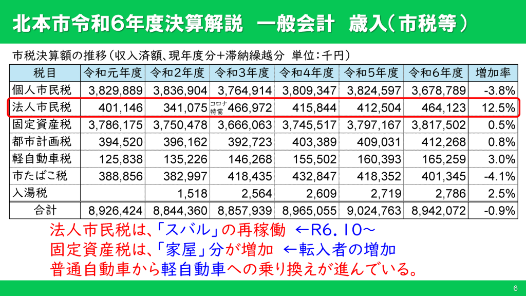法人市民税は、令和6年10月に再稼働となったスバル北本工場の影響が大きく、12.5%の大幅増となりました。スバルの再稼働は令和6年10月からなので、その影響は半年分です。令和7年度は更なる増収が見込めます。
