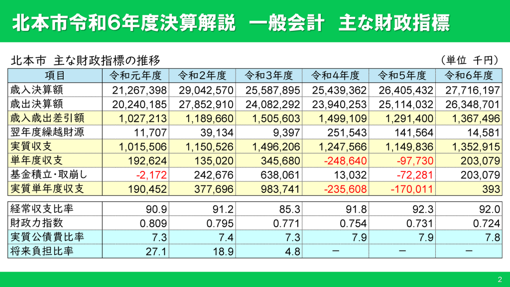 実質収支は約13.5億円の黒字となりましたが、令和6年度中に基金から約15.4億円を繰出し(取り崩し)、これを使い切らなかった影響によるもので、実質単年度収支ではほぼ均衡という状態になりました。