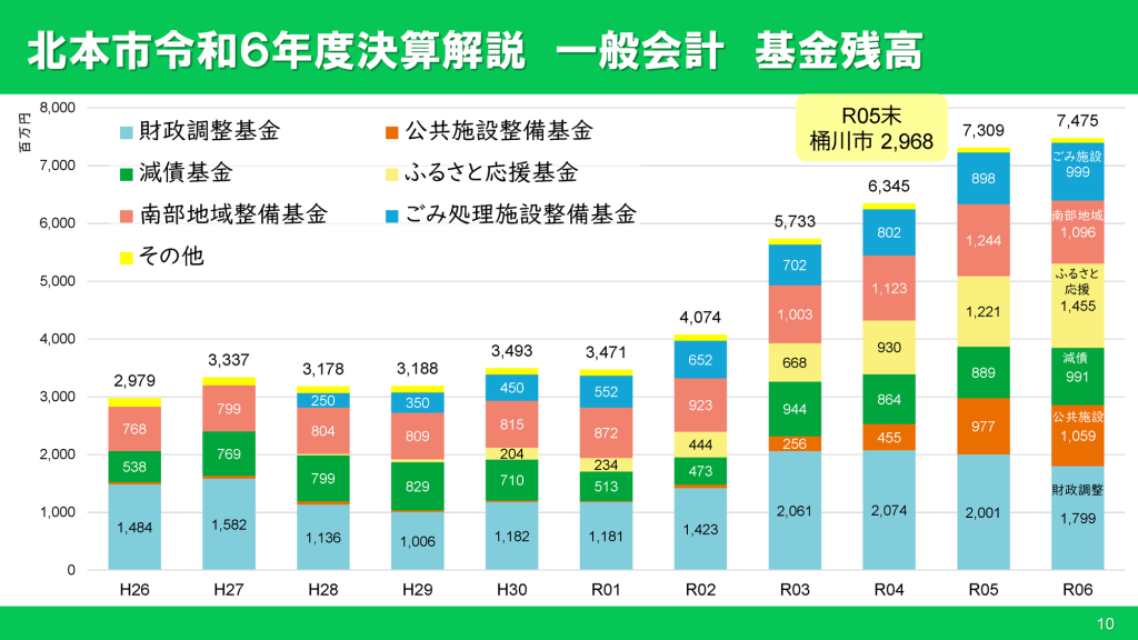 基金残高の総額は、前年度から約1.7億円増の74億7500万円となりました。財政調整基金は20億円から18億円に減少したものの、ふるさと納税寄附金の積立てであるふるさと応援基金は12.2億円から14.6億円に、新ごみ処理施設整備基金は9億円から10億円に増加しました。南部地域整備基金は、久保特定土地区画整理事業の進捗を図るため、1.5億円を取り崩しました。