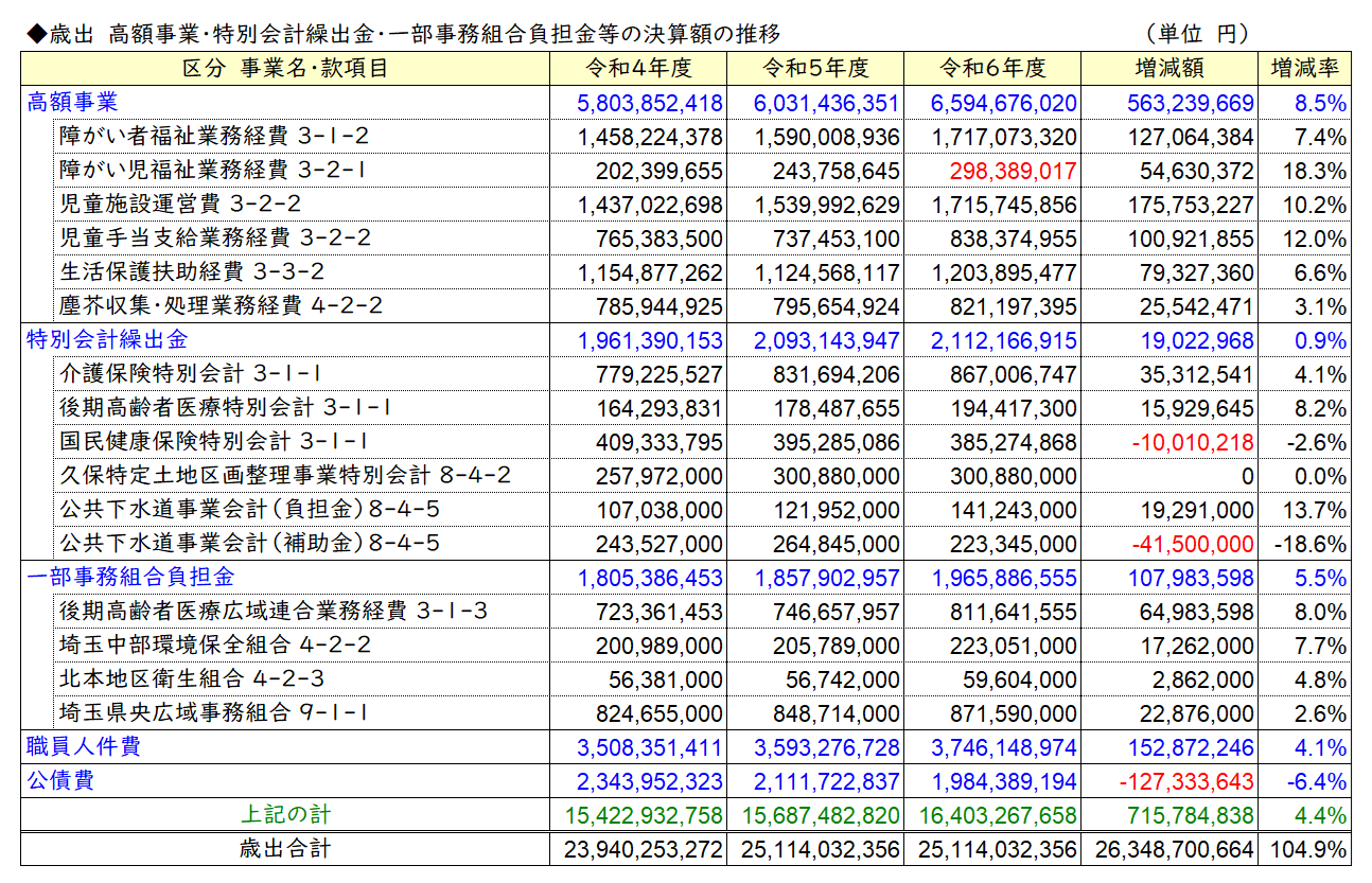 令和6年度に大きく増加したのは民生費と教育費です。
