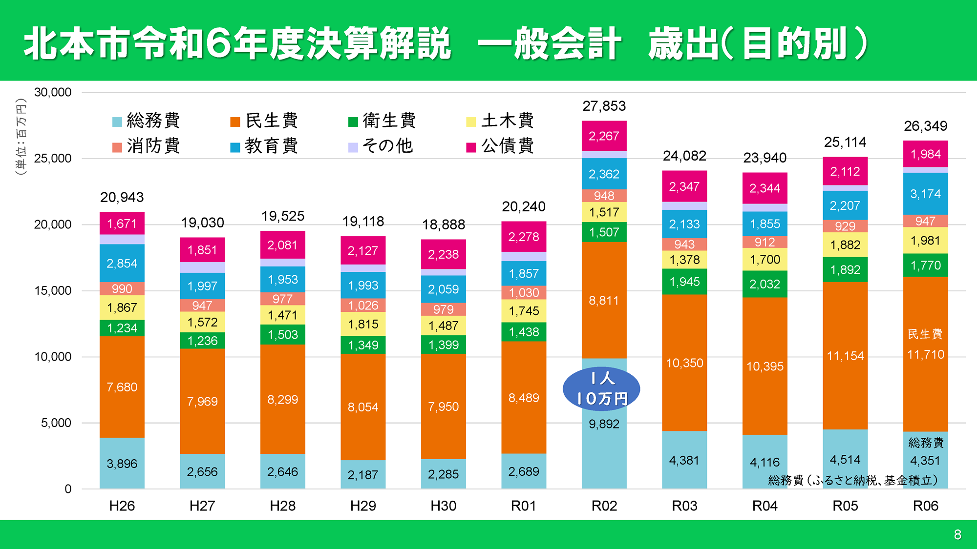 土木費は総合公園野球場スコアボードの改修(約1.3億円)等により約1億円増加しました。