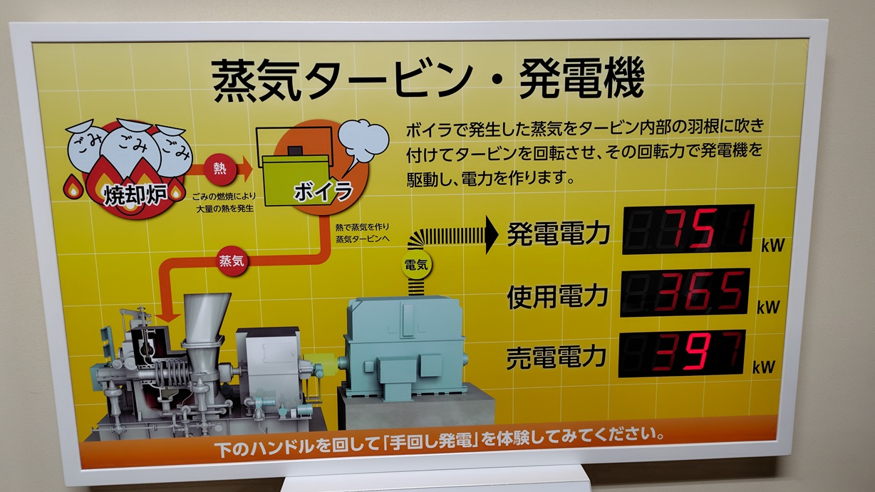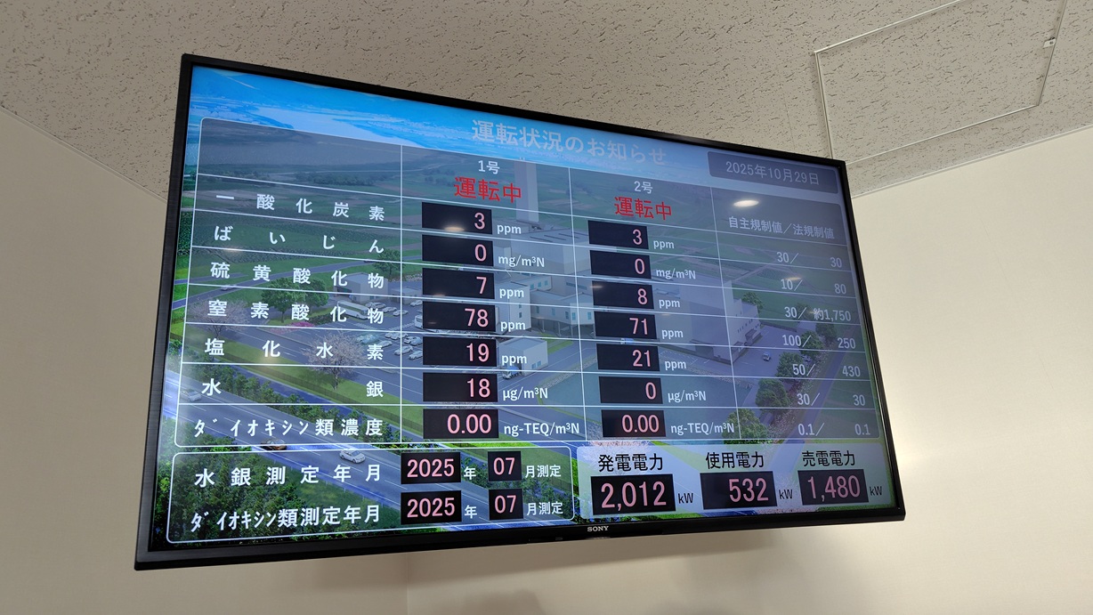 平成24年6月着工、平成27年3月に完成しました。敷地面積や約28,520㎡、事業方式はDBO方式です。ごみ焼却施設の処理能力は日量94トン(47トン×2炉/ストーカ方式)、粗大ごみ処理施設は10トン/5時間です。焼却時の熱を使い発電しており、最大で1370キロワット、一般家庭の3300世帯分の発電をしています。電気は場内で活用し、余った電力は売電しています。稼働から11年、運営の委託期間は20年間なので、ちょうど折り返したところです。