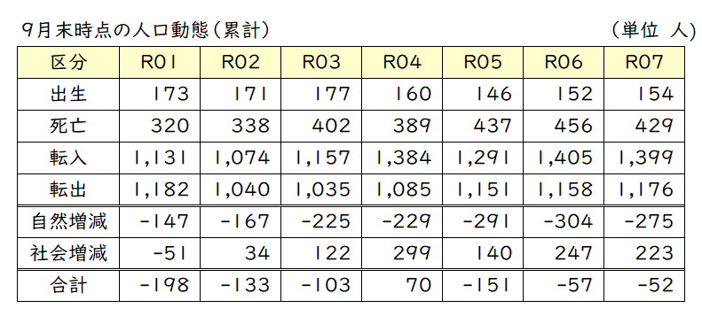 転入者数は引き続き高水準で、前年度からは6人減。転出者数も高水準で、前年度から19人増となり、社会増減は223人増となりました。人口は8月末時点で一旦65,000人を下回りましたが、9月は人口増となり、再び65,000人台に回復しています。