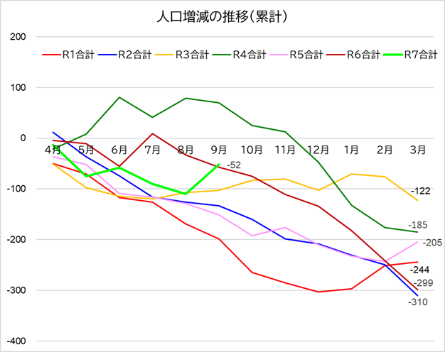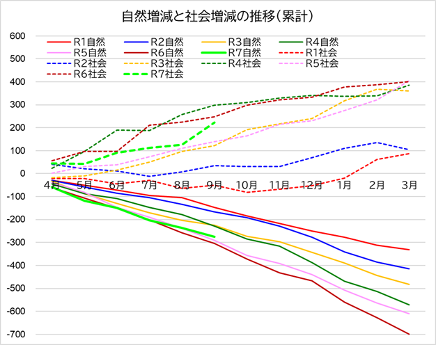社会増減はプラスを維持しているものの、令和4年度や令和6年度と比べると少なく、自然減は以前高水準となっており、人口減少が顕著です。7月末の人口は65,019人でかろうじて6万5千人台をキープしていますが、割り込むのも時間の問題となってきました。